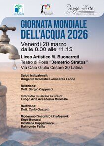 GIORNATA MONDIALE DELL'ACQUA 2026 Evento a cura del Liceo Artistico di Latina Presso il Teatro di Posa "Demetrio Stratos", all'interno del Liceo Artistico "Michelangelo Buonarroti" di Latina | ![]() | Venerdì 20 marzo 2026, dalle 8:30 alle 11:15 Teatro di Posa “Demetrio Stratos” Liceo Artistico M. Buonarroti di Latina Evento dedicato alla Giornata Mondiale dell’Acqua 2026, capace di unire educazione ambientale, interventi scientifici e musica dal vivo. |
